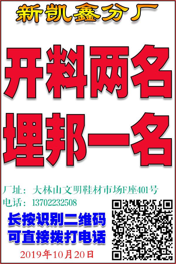 新凯鑫分厂 开料两名 埋邦一名 厂址:大林山文明鞋材市场F座401号 电话:13702232508