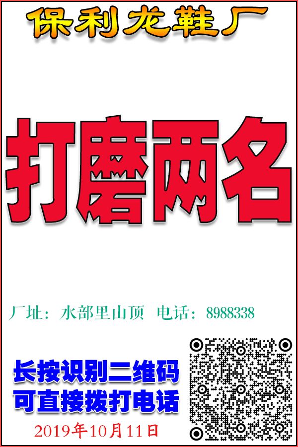 保利龙鞋厂 打磨两名 厂址:水部里山顶 电话:8988338