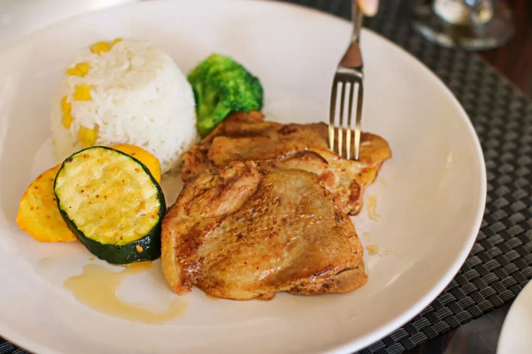切开之后,隔着薄薄的一层油脂,汁从肉里迸出,鸡肉香而不柴,超级下饭!!如果喜欢酥脆的口感,还可以让师傅多煎烤一会。