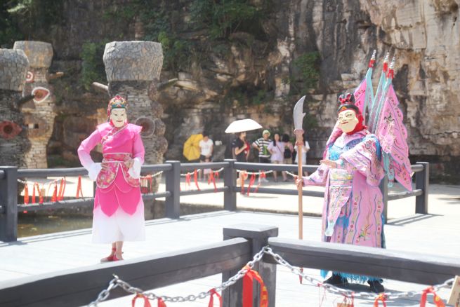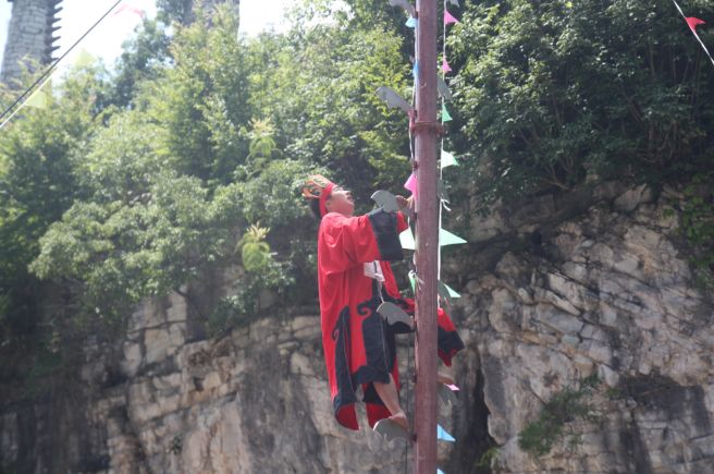 【游玩】夜郎谷大致分为城堡区和林区两个部分,一般选择从城堡区开始。除了自己钻到各个角落探秘,到几家颇有特色的小店学习体验版画、参与投壶娱乐,还能到河谷下面看傩戏演出。演出每天有两场,分别是11:30和15:30,傩戏从《霸王别姬》、《三战吕布》、《古城相会》等著名剧目中随机抽取3个,惊心动魄的傩技表演《上刀山》、《下火海》、《悬心吊斗》穿插其中。
