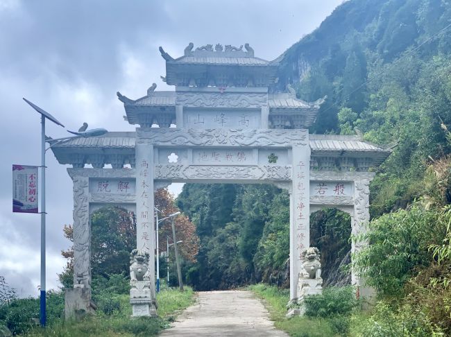 第四站:高峰山 【交通】平寨村与高峰山相距仅11公里,从平寨村离开,走北斗湖路,往王家院村方向,至“高峰山”石牌坊时,不要犹豫,盘山而上,不一会儿就能抵达“云山一现”的大门口,车可以停在这里,也能再按照路牌行驶一段停到“万华禅院”正门处。停车10元。
