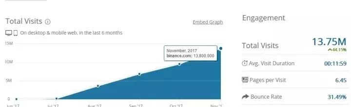 2017年8月-11月币安网站访问量猛增 创立之初,币安就将自己定位于国际化交易平台。凭借灵敏的嗅觉和敢为天下先的勇气,成立短短165天,币安便成为了全球交易量第一的交易所。 取得这样的成绩,实际绝非只有机遇的成分。 当其他交易所纷纷效仿币安出海时,才发觉进军海外市场并不容易,当中还涉及国情、语言、用户习惯等等多个复杂因素。最终,他们也不过只是把海外据点作为规避国内监管风险的工具,谁也没有打算啃下海外市场这块未知且复杂的蛋糕。 唯有币安一直坚持深耕海外市场。