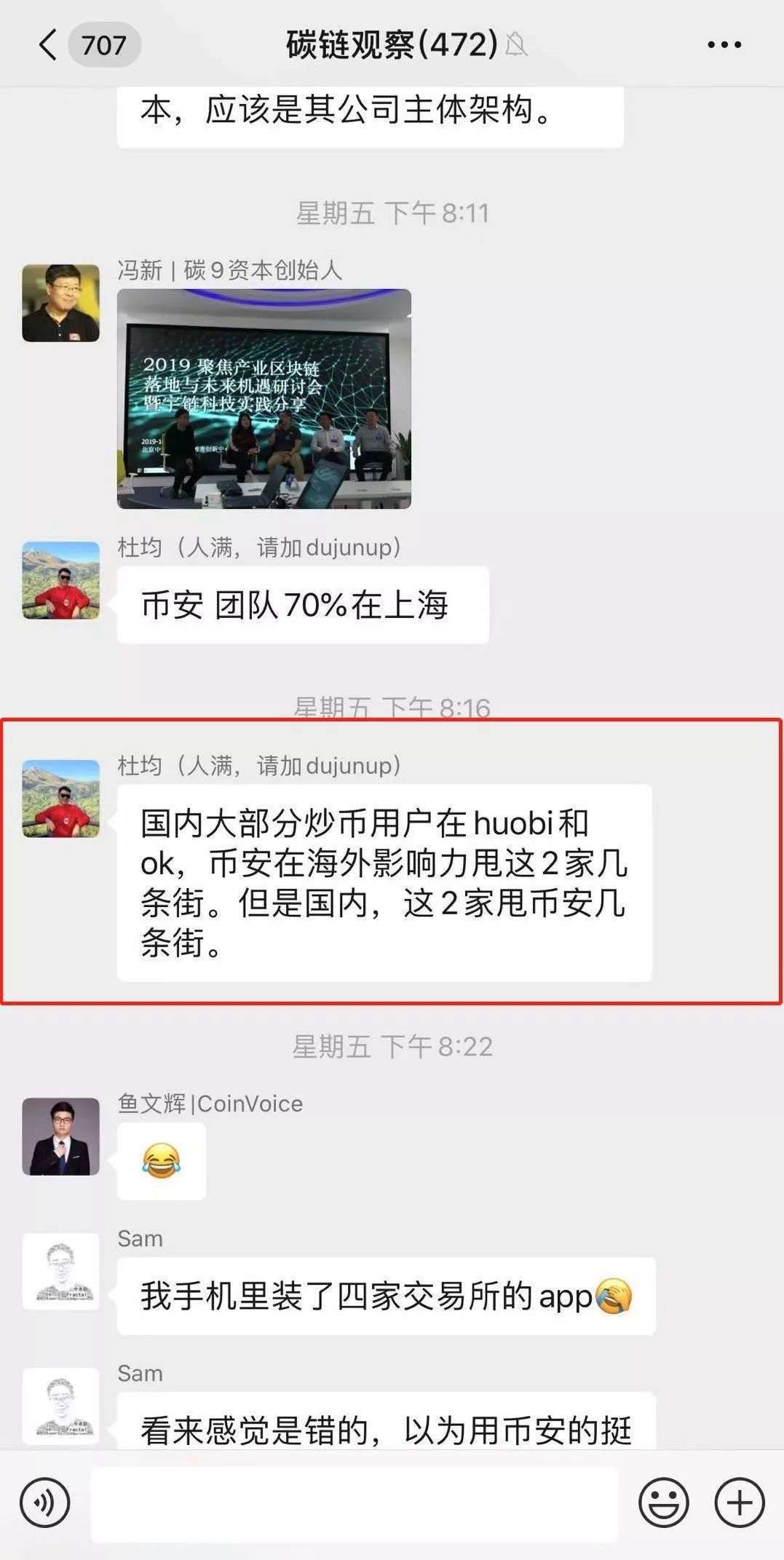 在杜均看来,亦是如此。最近,他在群里谈到,“国内大部分炒币用户在火币和OK,币安在海外力甩这2家几条街。但是国内,这2家甩币安几条街。”