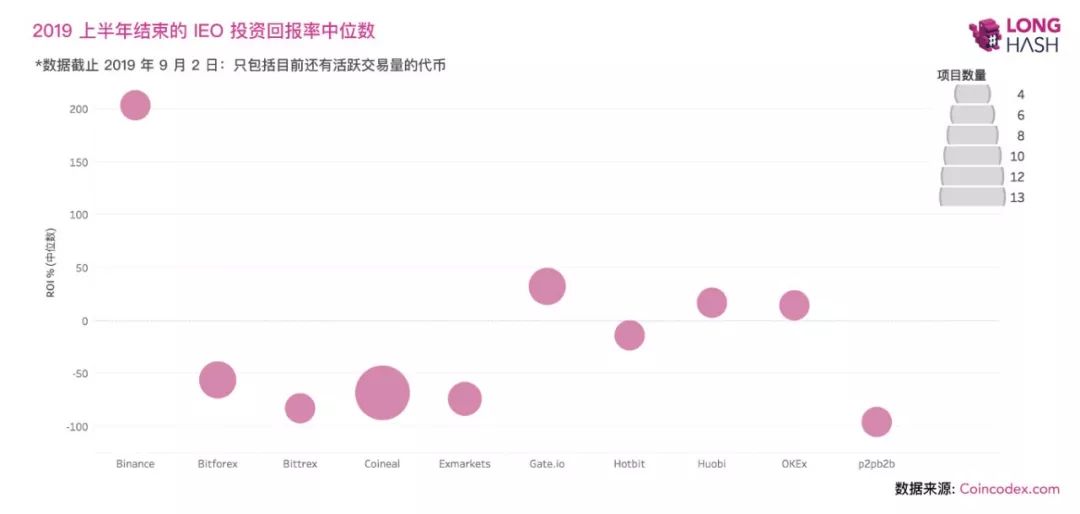 据Longhash数据显示,2019年上半年结束的IEO回报率中位数,只有币安以200%的投资回报率遥遥领先。剩余交易所中只有Gate.io、火币和OKEx的回报率处于正值,其他的IEO都是亏损的。