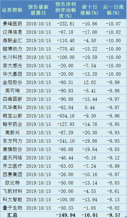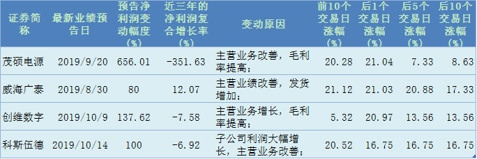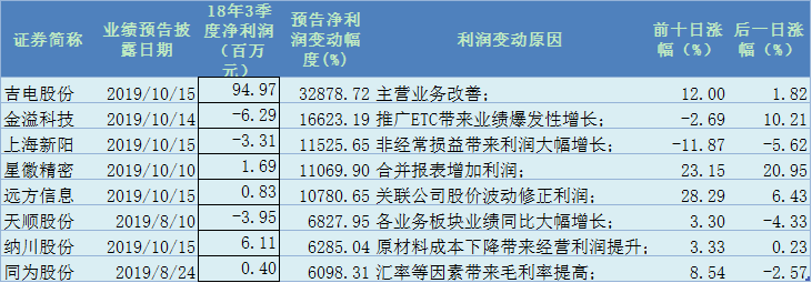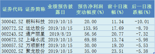 注:业绩披露后不满5/10个交易日,按照披露日当天到10月15日的实际交易日统计;预告净利润变动幅度(%),指的是上市公司披露的预测净利润同比增长上、下限中,取较大绝对值,即:Max[ABS(预告净利润同比增长上限),ABS(预告净利润同比增长下限)],下同;