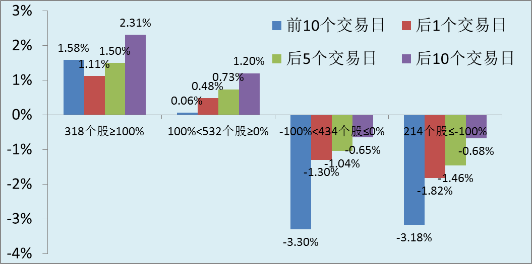 通过对1498家预告有明确披露净利润变动幅度的公司进行统计和分析,分别算出业绩预披露当天和前10个交易日、后1个交易日、后5个交易日、后10个交易日的平均涨跌幅。