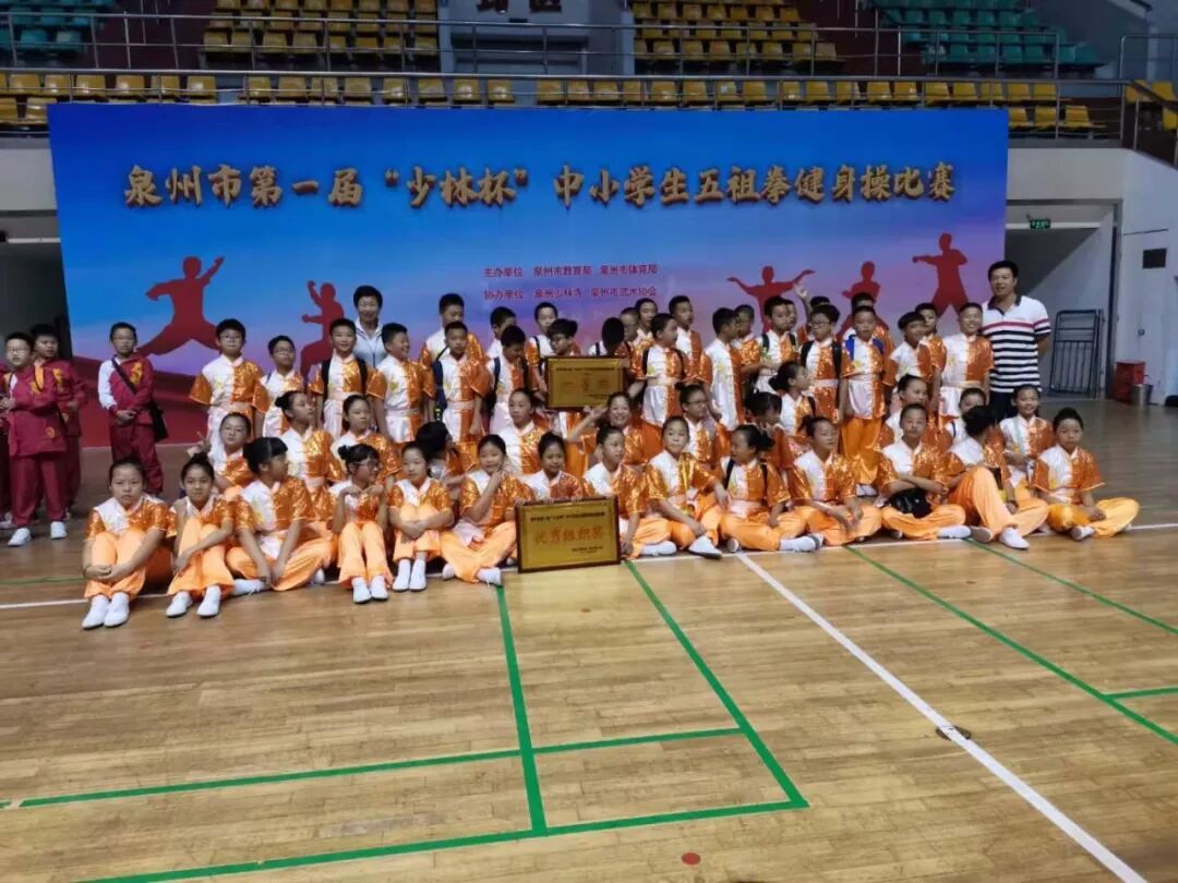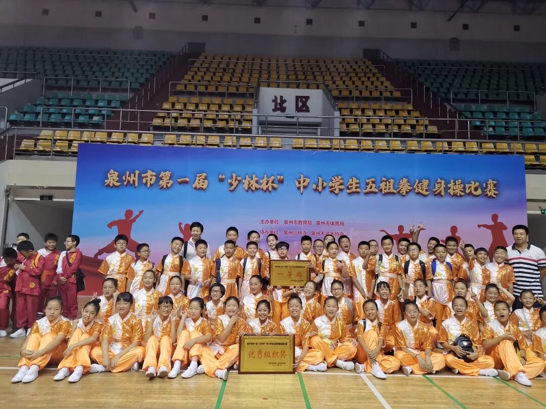 2019年10月19日,泉州市中小学生“南少林五祖拳健身操”比赛在泉州市侨乡体育馆隆重举行。此次参加比赛的参赛队伍是来自泉州各个县市区的中小学层层选拔后的最后胜出队伍。鲤城区实验小学48名学生,在比赛中充分发扬鲤城实小人奋勇夺冠、团结合作的体育精神,他们在场上的一招一式、刚劲有力、虎虎生风,在全市17支队伍中脱颖而出,荣获小学组一等奖总分第一名,取得四连冠的佳绩。同时也向在座的各位评委和观众展示了鲤城实小多年来在南少林武术进校园工作方面的积极探索所取得的课改成果。