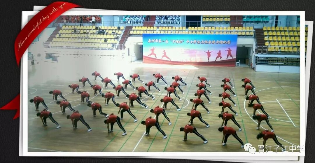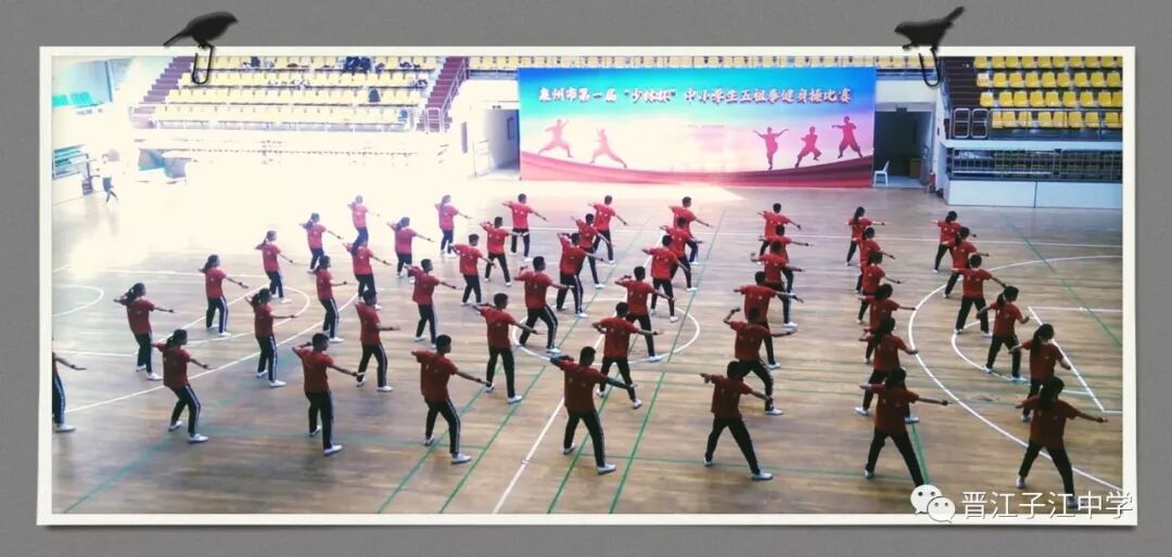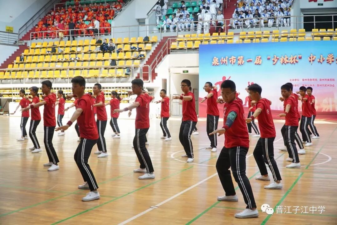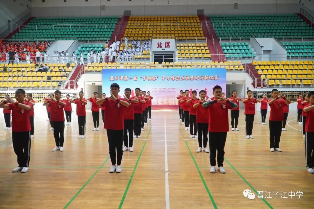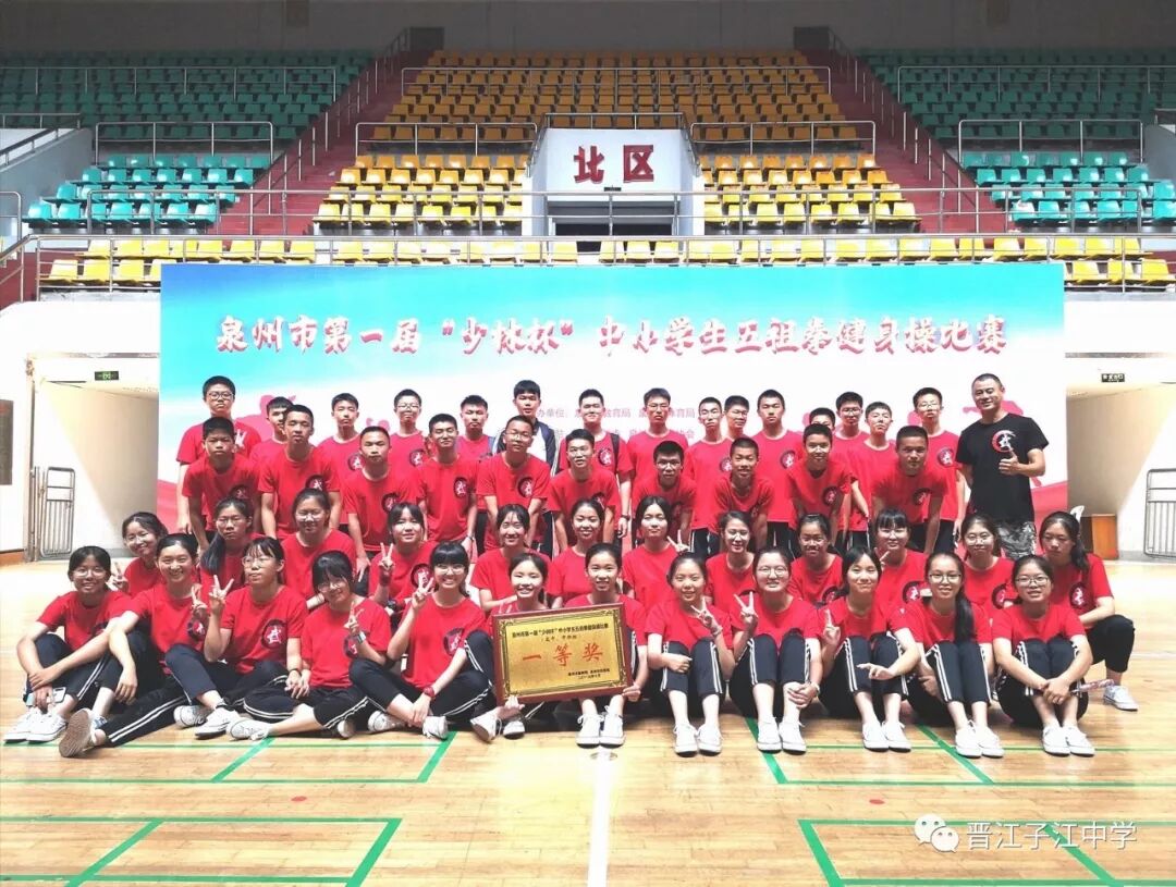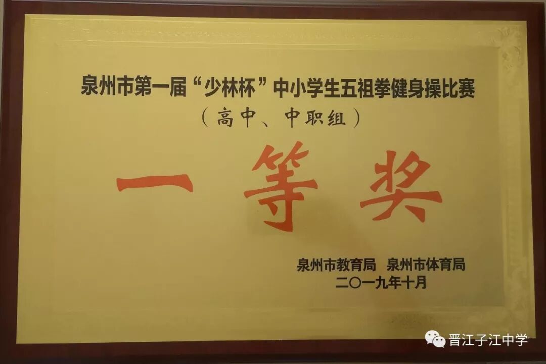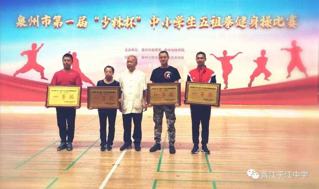 10月19日上午,由泉州市教育局、泉州市体育局联合举办的泉州市第一届“少林杯”中小学生五祖拳健身操比赛在泉州侨乡体育馆举行。本次比赛共有来自市直及各县42支代表队参加小学、初中、高中三个组别的比赛。我校高中五祖拳队代表晋江市参加高中组别的比赛,经过激烈角逐,最终取得总比分第一的优异成绩,荣获一等奖。特此祝贺!