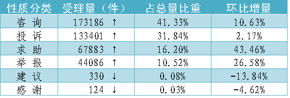 2019年第三季度,市政务服务热线受理群众诉求共419010件,同比上升31.64%,日均受理4554件,群众满意率91.76%。制单278698件,其中,直办94531件;转相关责任主体单位调查办理184161件,按时办结率99.99%。