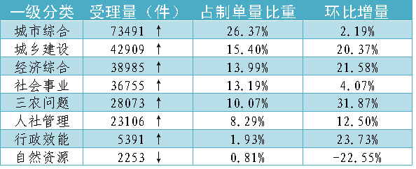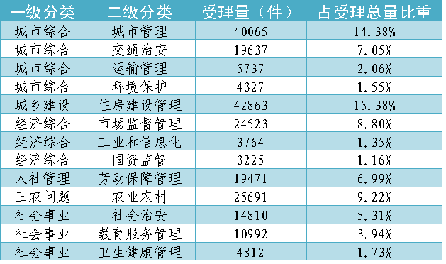 2.二级分类。包括居民生活、运输管理、住房建设管理、劳动纠纷、工商管理、社会治安、交通治安、农村工作等96项。月受理量超过3000件的类别有13项,占制单量的78.91%。