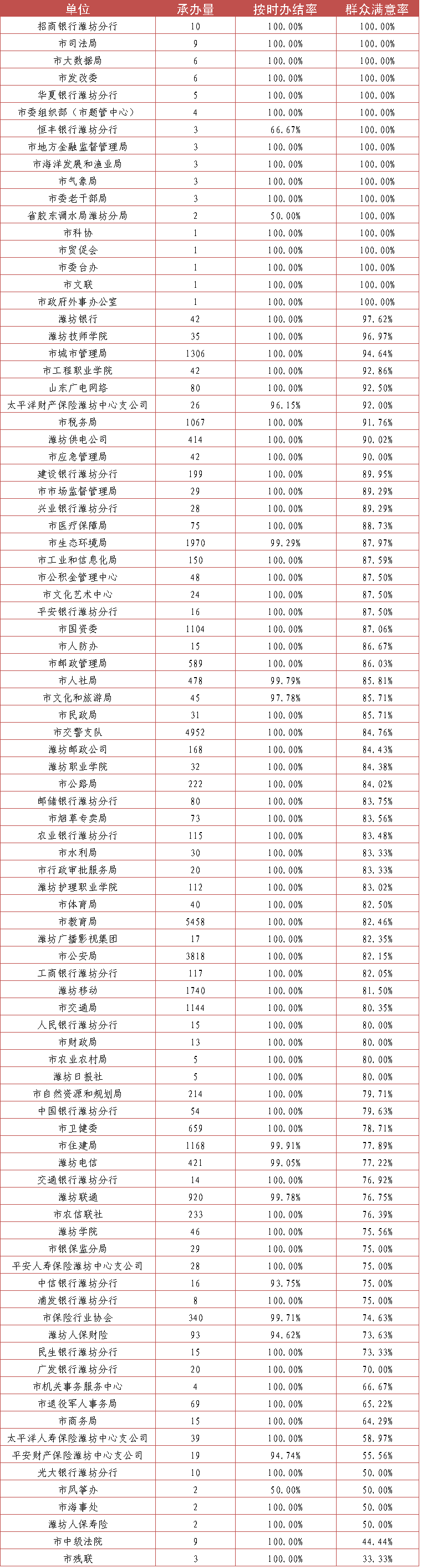 市教育局、市交警支队、市公安局分别以5458件、4952件、3818件位列办理量前三位。从办理满意率看,月承办单量10件以下且办理满意率100%的有17个单位,分别是:招商银行潍坊分行、市司法局、市发改委、市大数据局、华夏银行潍坊分行、市委组织部、市委老干部局、市海渔局、市地方金融监管局、恒丰银行潍坊分行、市气象局、省调水运维护中心潍坊分中心、市委台办、市文联、市科协、市贸促会、市外办;月承办单量10件以上且办理办理满意率90%以上的有9个单位:潍坊银行、潍坊技师学院、市城市管理局、工程职业学院、山东广电网络、太平洋财险、市税务局、潍坊供电公司、市应急管理局。