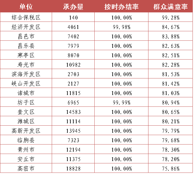 高密市办理量最多,共18828件;其次是奎文区,共14583件;综合保税区办理量最少,共140件。从办理情况看,综合保税区、经济开发区、昌邑市分别以办理满意率99.28%、84.67%、83.88%居前三位。