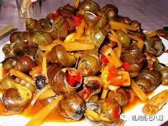 不得不说的就是大家最爱的“撩螺'了!将浸泡吐尽泥沙的田螺,用姜、酒、蒜末、紫苏等调料油爆,佐以汤汁慢火煮熟即成,吃时先将田螺放入嘴边吮一下,再用针挑出螺肉,吮进嘴里,回味无穷啊!