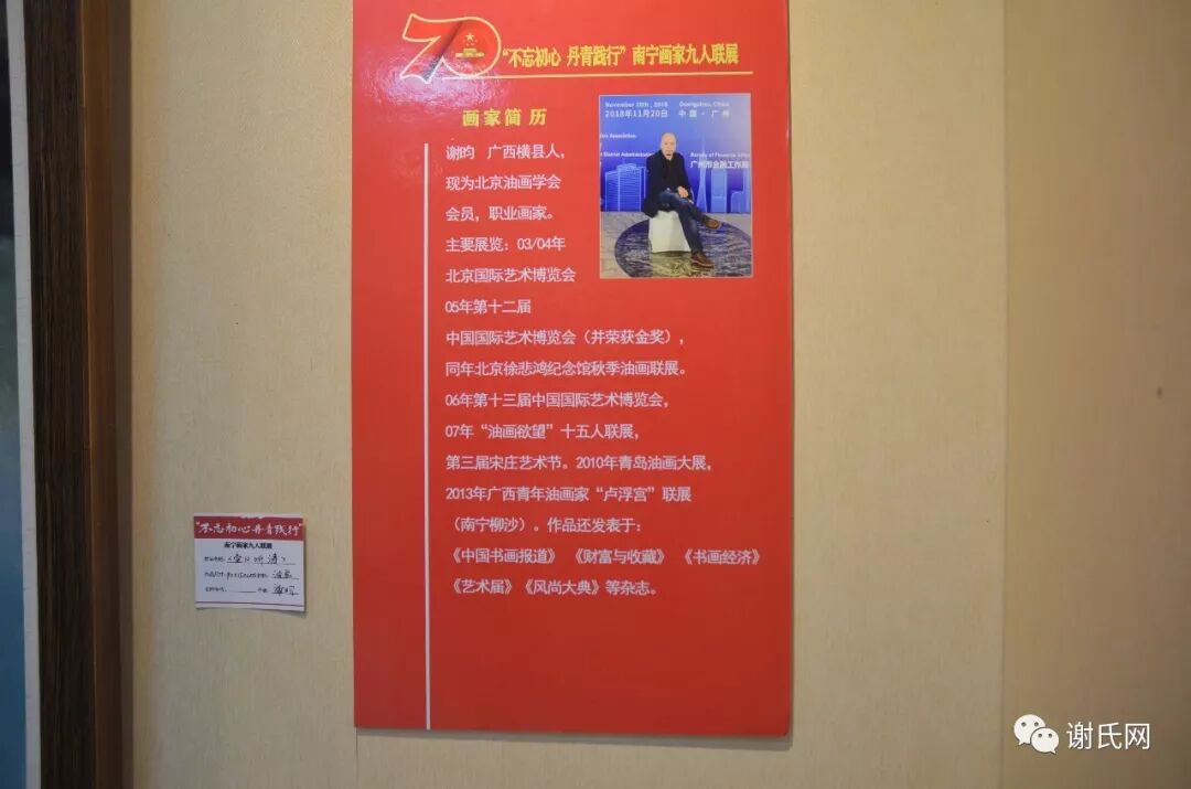 南宁市工人文化宫召开了谢昀等九位画家联合画展 2019年10月19日下午,广西南宁市工人文化宫四楼展厅召开了南宁画家谢昀等九人联合画展活动。画家们展示了自己的作品100多幅,吸引了数百名各行业的书画爱好者前来参观欣赏。原广西总工会副主席、第二届广西谢氏联谊会会长谢柳生出席了活动并发表了讲话。随后,本网小编采访了谢柳生会长、南宁市工人文化宫领导、青年油画家谢昀等名人。