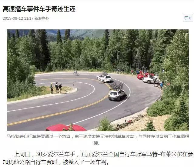 2015年8月,30岁爱尔兰车手,五届爱尔兰全国自行车冠军马特-布莱米尔在参加犹他公路自行车赛时,被卷入了一场车祸。