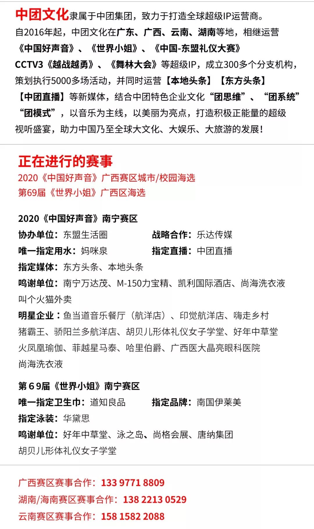与超级IP共舞,与强者同行!更多超级IP合作及授权事宜,欢迎您来2020《中国好声音》广西赛区组委会面谈:合作电话:133 9771 8809报名咨询:0771-5726065 181 5462 1546联系邮箱:ztwh08@163.com办公地点:南宁市青秀区航洋城C座2706~2708室