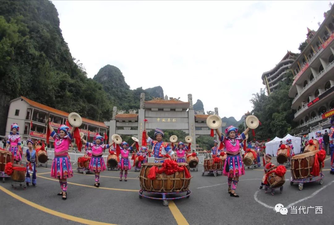 在弄拉景区内,马山群众擂响会鼓为车手加油。记者 张友豪 摄