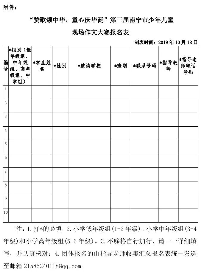 报名方式1.方式一(团体报名):各校老师负责组织学生报名,拨打报名电话0771-3143196,确定报名成功后,负责老师汇总填好学生报名表发送至邮箱:2158524011@qq.com。