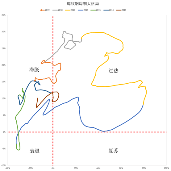 最后是对大类资产的观点:以铜博士为代表的宏观属性较强的商品在2020年会是牛市,对于其它进入滞涨期的商品,比如黑色产业链,以螺纹为例,目前的周期处在滞胀阶段并且正朝着衰退阶段运动。所以进入滞胀黑色和能化就没有大行情了。