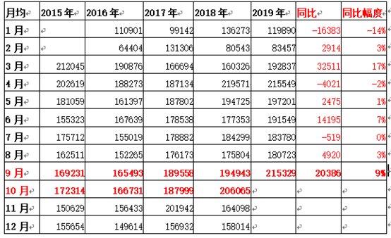 本周螺纹钢表观需求量411万吨,总库存下降57万吨,根据我们前期推演本周螺纹钢降库在47-63万吨之间,基本符合预期。当前螺纹钢表观需求能够达到411万吨(仅次于今年4月需求最好的时候)显示出当前需求的任性。另外从我们统计的237家建材成交量来看,今年9月份日均成交达到21.53万吨,同比高9%,而从历史统计的数据来看,10月环比9月变化不会太大,同时从我们了解的情况来看,整体10月需求环比9月或下滑不会太大,预计整体成交能够维持21万吨左右。表2:237家建材成交量(单位吨,预计10月21万吨左右)