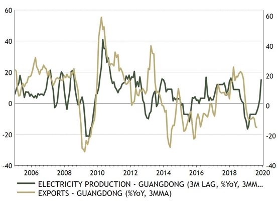 上图浅绿色线是中国的信贷脉冲,深绿色线是美国ISM制造业指数,从2008年以来,现在处在第四次脉冲上行阶段,如果这个图还不能完全确定经济上行的话,我们再来看下广东的发电量: