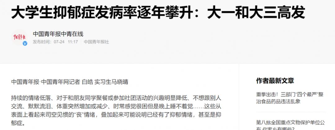 中国青年报曾报道:大学生抑郁症逐年攀升,其中大一和大三是抑郁症高发期!