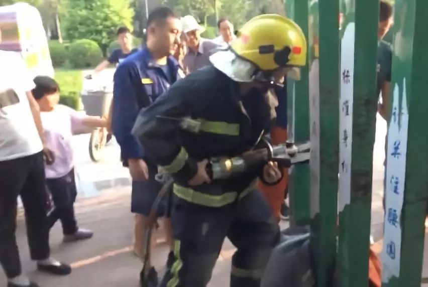 当地消防大队接到报警后火速赶往现场。孩子家长和周围群众在安抚孩子。消防指战员用液压扩张器,仅用了不到一分钟就帮助孩子脱困了。