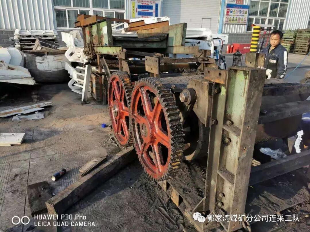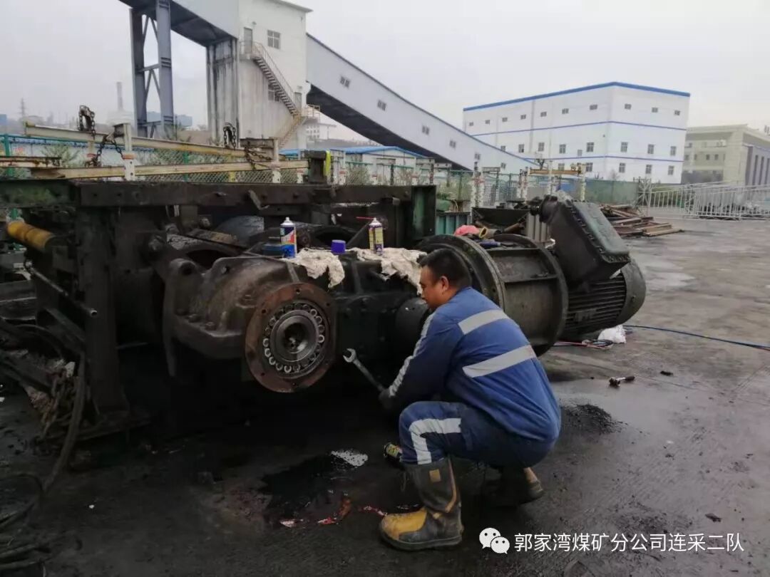 10月17日,郭家湾煤矿分公司连采二队为适应中部回风大巷工作面的需要,在龙门吊场地对皮带运输机头电机进行调向。