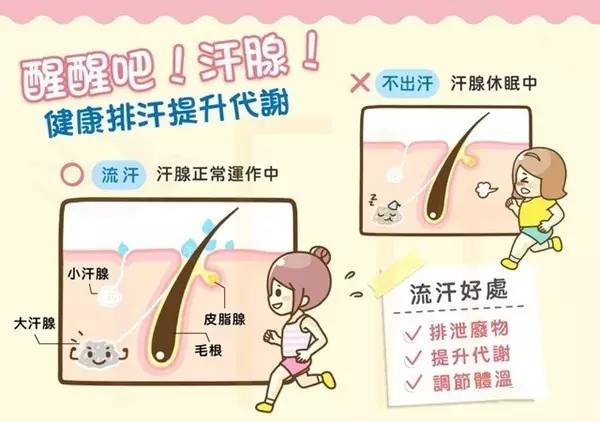 天气太热,很多人恨不得天天躲在“空调房”里,这就导致了本该是出汗的季节,你却出不了汗!甚至还有一些人,出门时涂上止汗露等产品,以防汗水把衣服弄湿。可是你知道吗?其实夏季多出汗更有益健康。