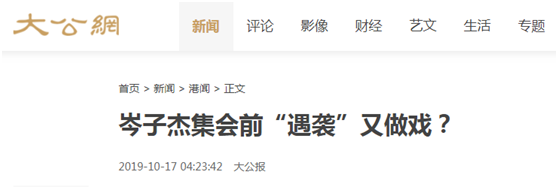 岑子某系于去年成为“民阵”召集人,今年10月10日声称参选2019年香港区议会选举。由于“民阵”曾预告今年10月20日搞“集会”,《大公报》在报道中称,其在此之前却宣布参选区议会选举的岑子某16日突然遇袭,“时机巧合得让人难以置信”。