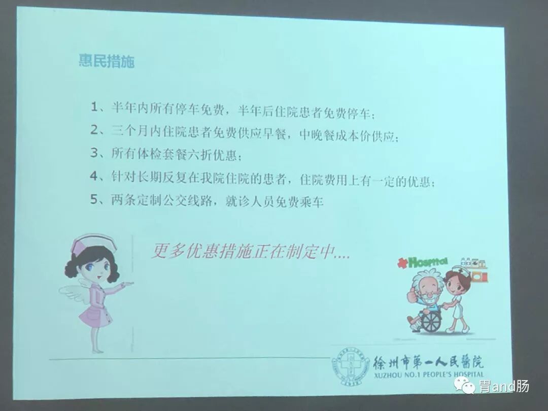 徐州市一院正在完成搬迁前准备工作,即将搬迁的新院优惠政策正式出炉,如下: 1、半年内停车免费 2、三个月内住院患者早餐免费,中、晚餐成本价供应 3、所有体检套餐6折 4、对于老病号住院,住院费可享有一定的优惠 5、定制公交,就诊患者免费乘坐。