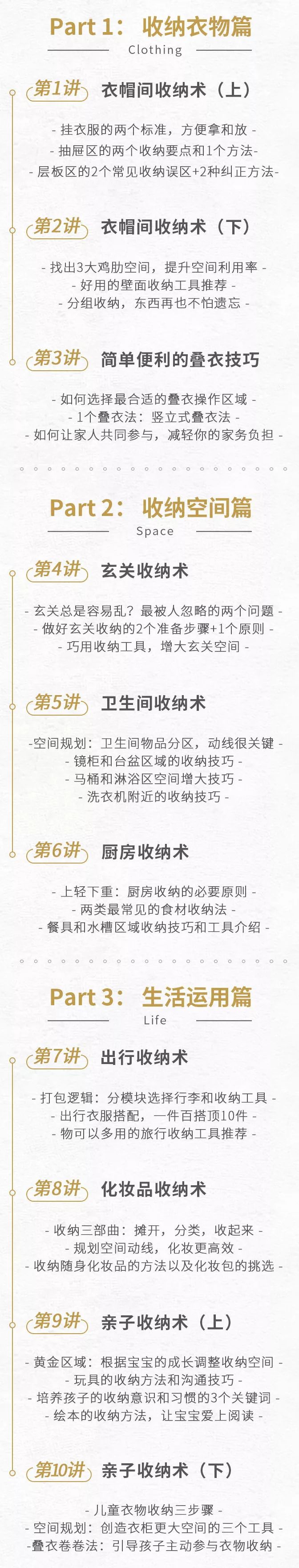 本次课程包括:收纳力理论+扩容技巧+收纳方法+丰富案例+实操讲解,涵盖你收纳过程中的方方面面。