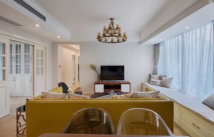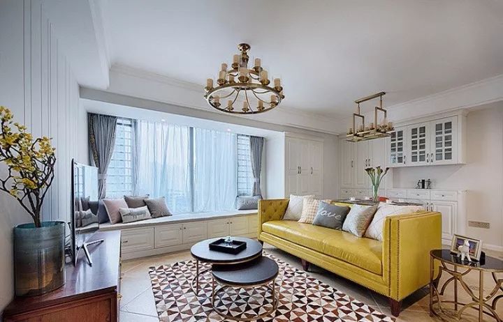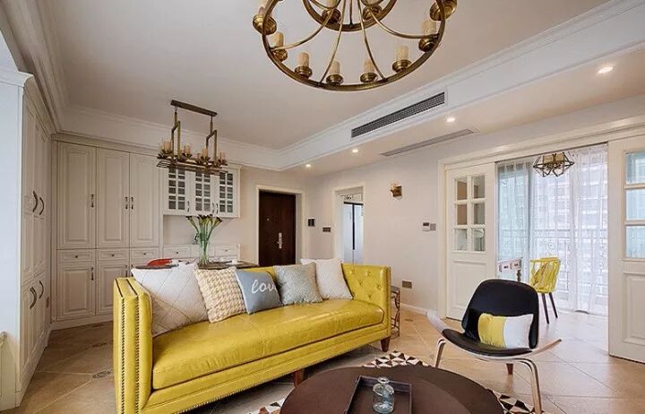 沙发采用了大胆的黄色,在浅色系中显得格外亮眼,不过又使得客厅变得更为时尚和明亮了。吊顶没有过多的装饰,但是烛台式吊灯也可以当做一个实用的装饰品了。