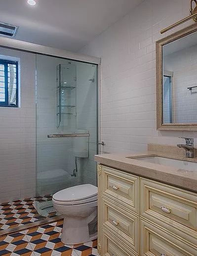 卫生间地面铺贴了很有立体感的瓷砖,具有防潮等作用。洗手区的浴室柜做工精美,就连浴室镜边框都把细节做得很有美感。