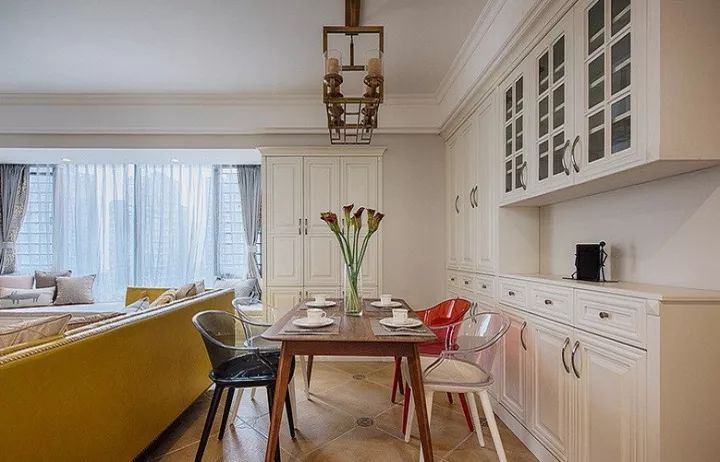 餐厅用了木质家具与强化塑料家具搭配,颇有古典与时尚结合的感觉,这样的视觉冲击更有个性。可以看到餐边柜将可利用的空间都运用起来了,扩大了居室空间收纳空间,可以看到整个家都被收拾得有条有理的。