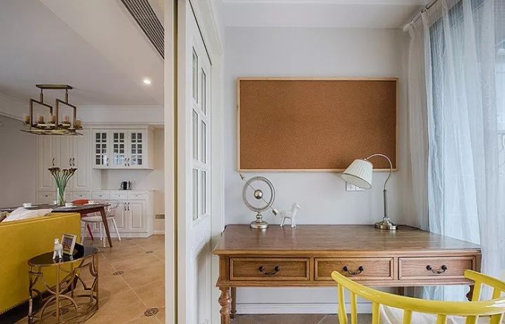 客厅旁边的阳台空间,安装了飘逸窗帘,摆上一张典雅木质书桌,配上一张时尚靠背椅,再放上台灯、装饰品、书籍等物品,就成为了个日常休闲区。
