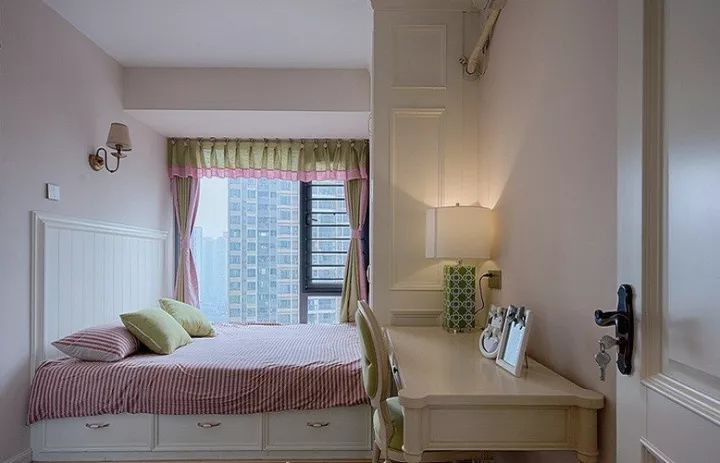 这显然是个儿童房了。开门进来就能看到一张简欧风格书桌映入眼前,而靠窗位置则摆放了床,并在床底位置装上地柜,用来收纳衣物。