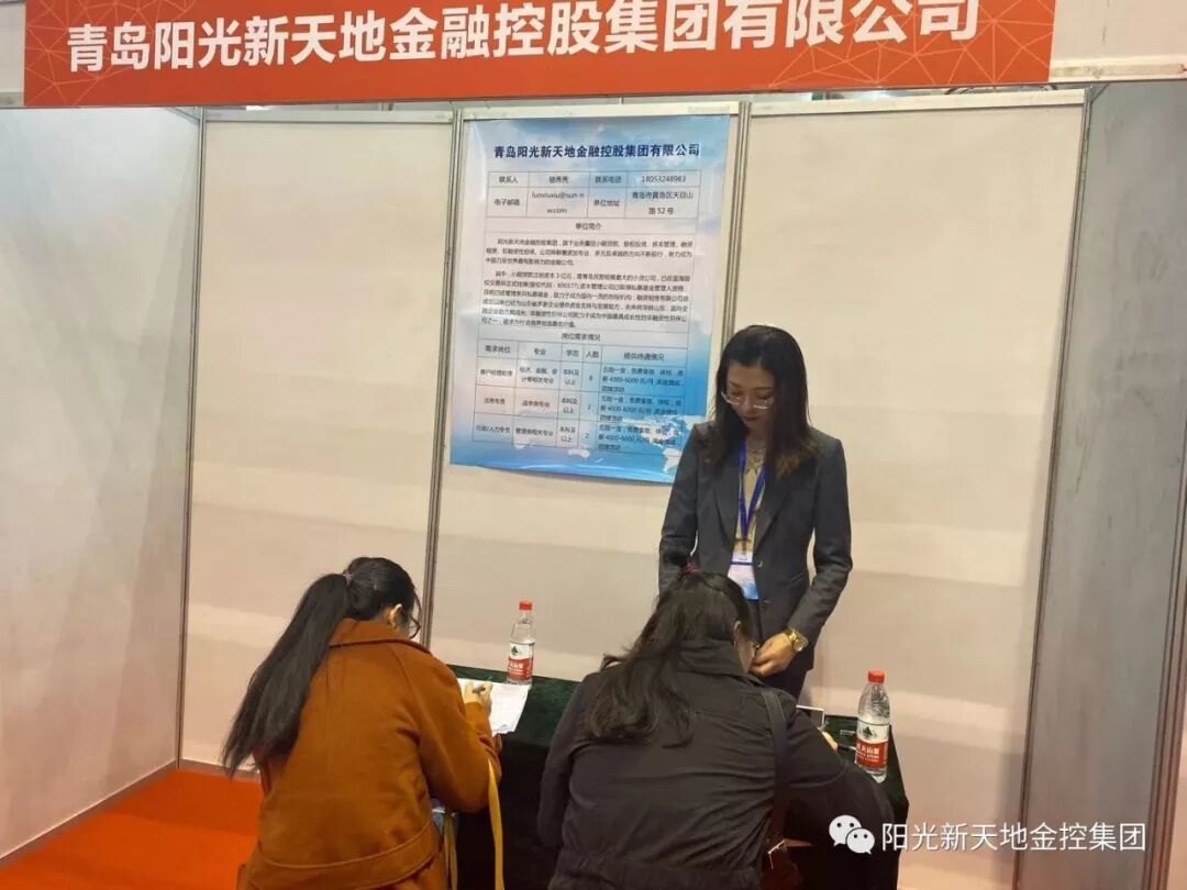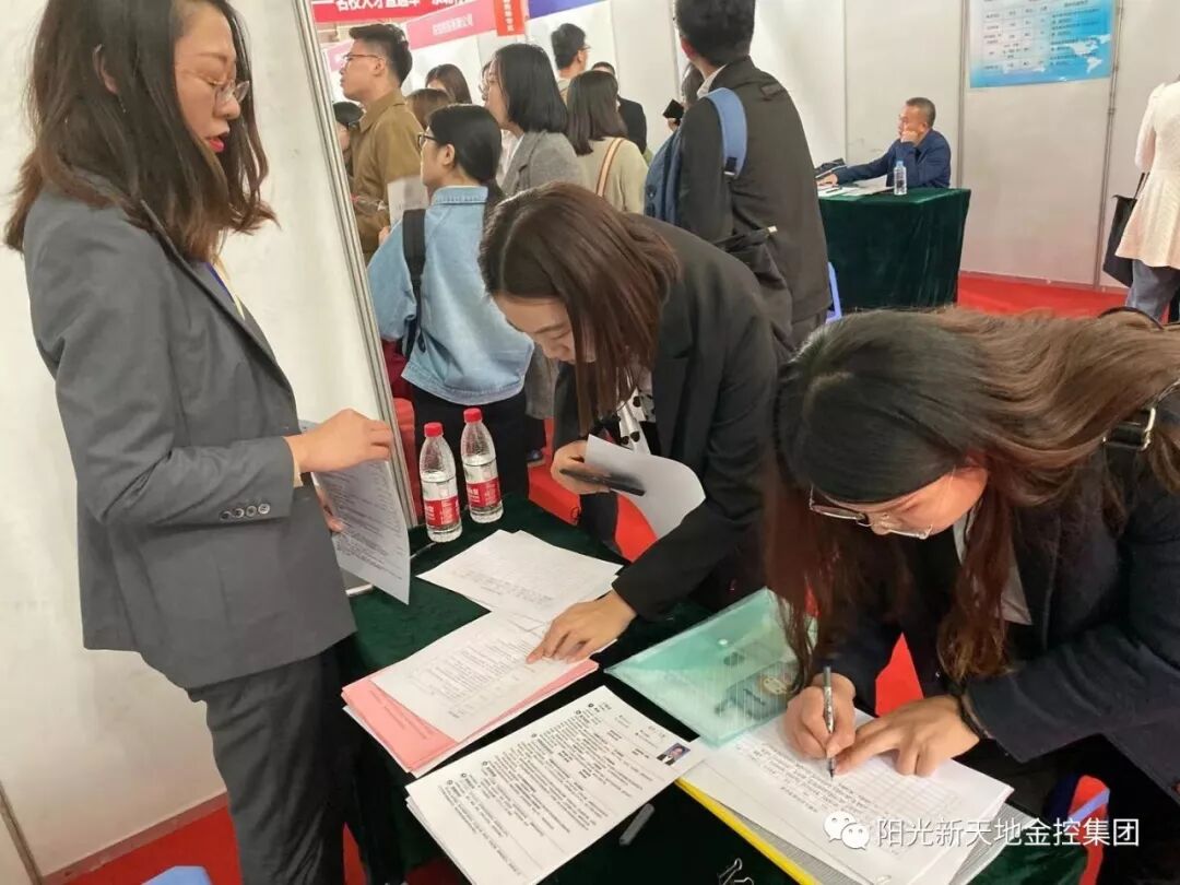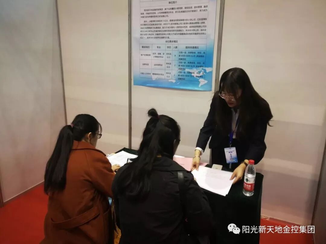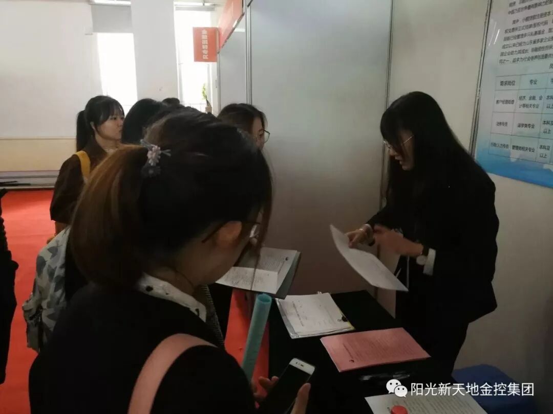招聘会场气氛热烈,井然有序,阳光新天地金控集团展位前,应聘者络绎不绝。我们依次向前来投递简历的同学们介绍了公司的发展历程和未来前景、旗下小额贷款、资本管理、融资租赁和非融资性担保四个板块的主营业务和发展方向以及需求岗位的主要职责及薪资情况。