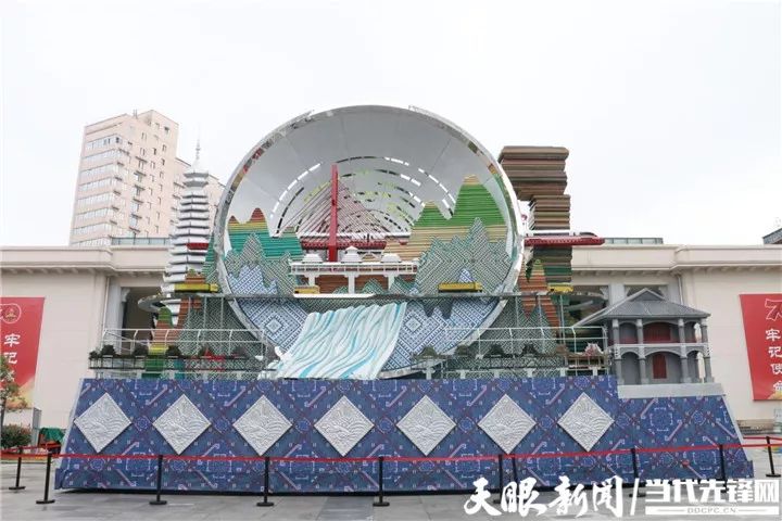 彩车右侧以贵州天眼望远镜造型为主要形态,展现了贵州在科技创新、天文领域取得的重大成就,同时艺术化处理为镂空框格,形成圆形“取景框”,寓意贵州人民对团结、团圆,圆满美好生活的期待。
