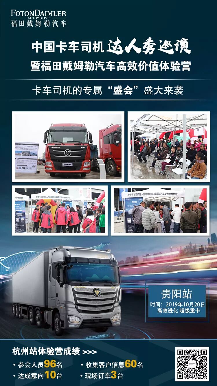 10月20日,中国卡车司机达人秀巡演暨福田戴姆勒汽车高效价值体验营登陆贵阳,本场活动现场迎来贵阳地区96名卡友,共收集客户信息60名,达成购车意向10名,现场成交3台。截止目前,本次活动已经走过了19站,参会人员超过1680名,收集客户信息1105名,达成购车意向147名,现场成交86台,可以说成绩斐然。