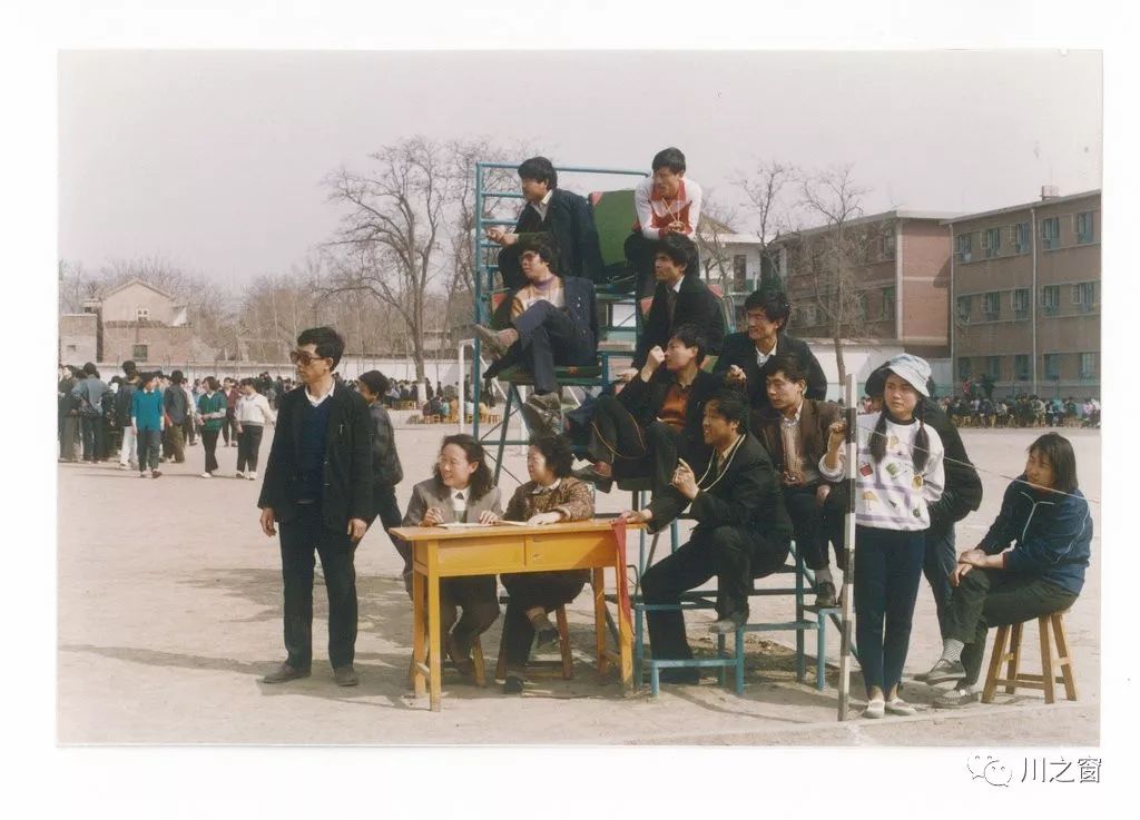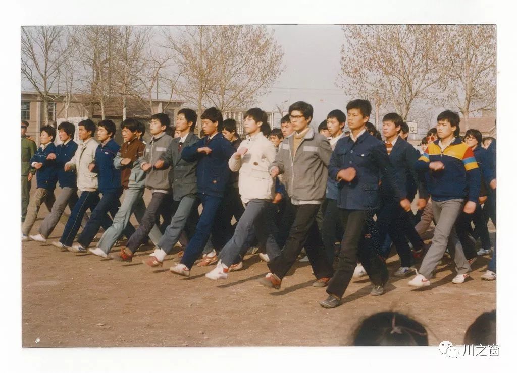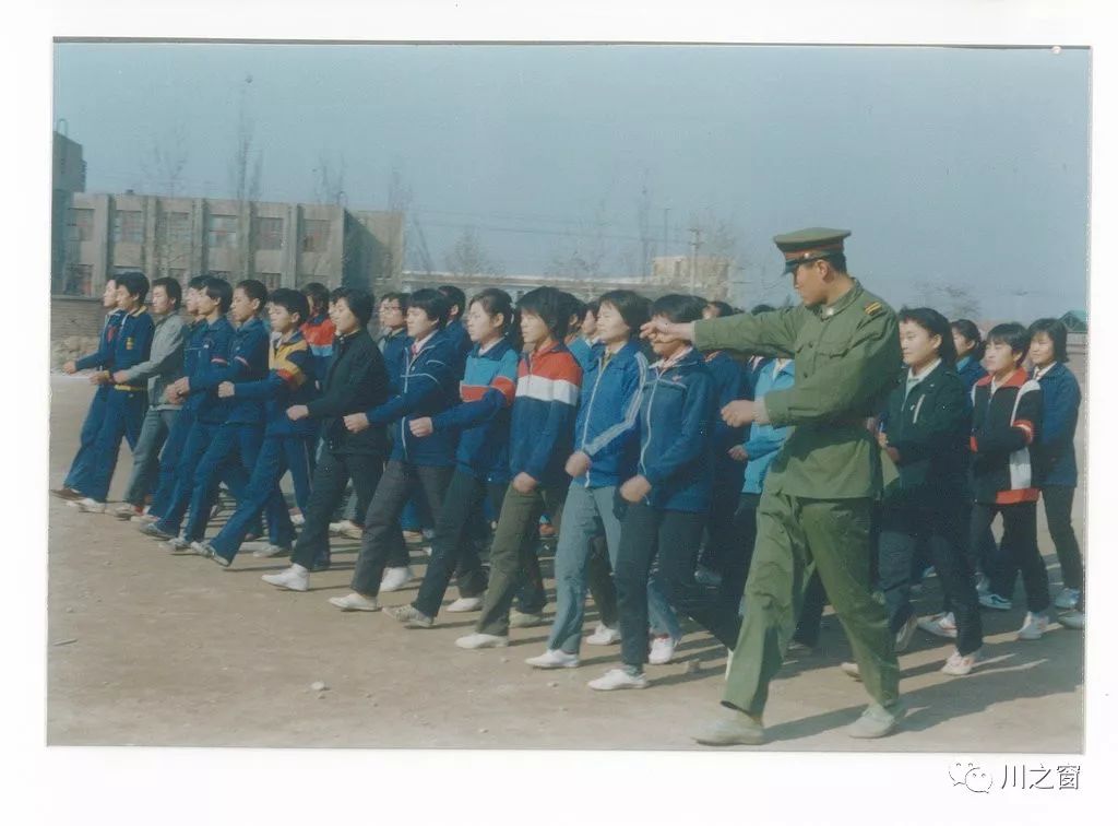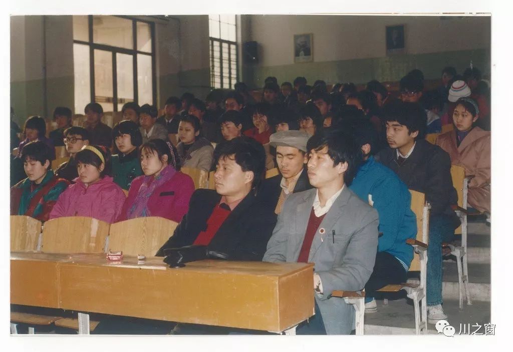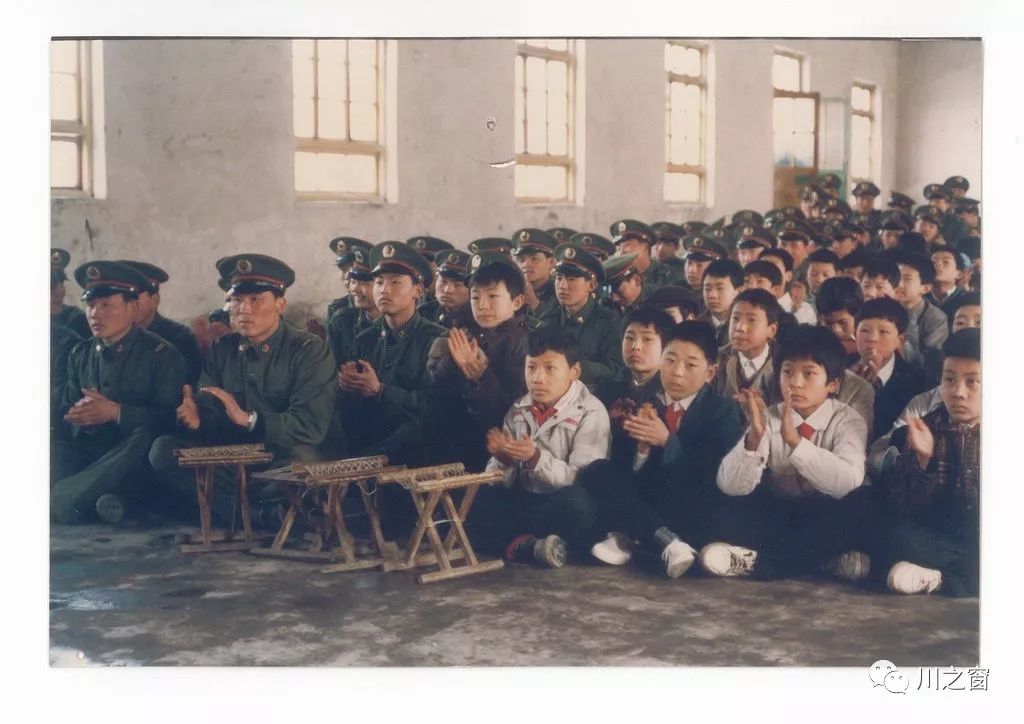 1990年3月4日下午,初1989级4班与防化连观看演出,互让座位,最后全部席地而坐