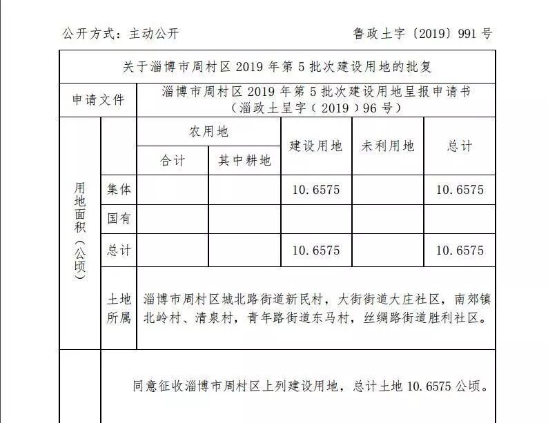 同意征收淄博市周村区上列建设用地,总计土地10.6575 公顷。