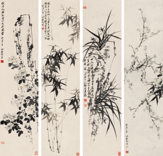 取法于徐渭、石涛、八大诸人,而自成家法,体貌疏朗,风格劲峭。