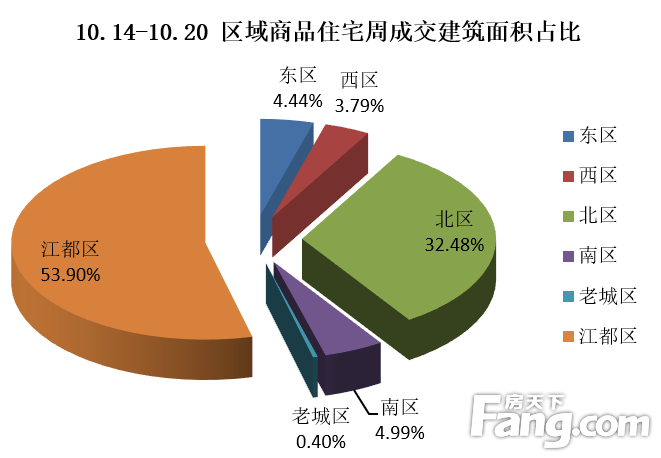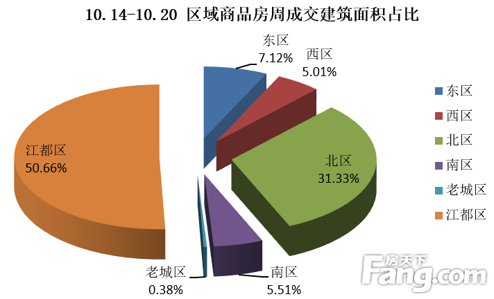 本周东区商品房成交3937平米,占市区商品房成交建筑面积的7.12%;西区商品房成交2770平米,占市区商品房成交建筑面积的5.01%;北区商品房成交17333平米,占市区商品房成交建筑面积的31.33%;南区商品房成交3049平米,占市区商品房成交建筑面积的5.51%;老城区商品房成交209平米,占市区商品房成交建筑面积的0.38%;江都区商品房成交28024平米,占市区商品房成交建筑面积的50.66%。