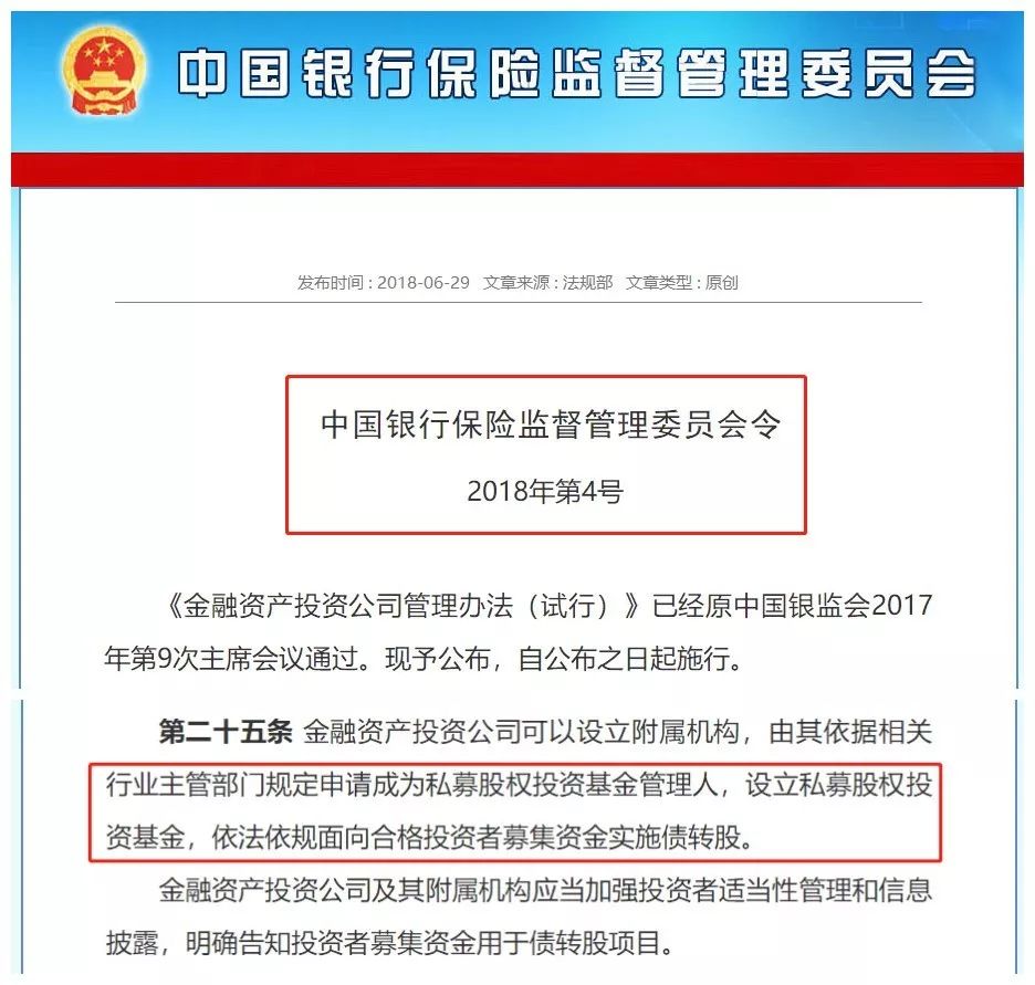 今年6月,银保监会发布的《金融资产投资公司管理办法(试行)》,第二十五条明确指出,金融资产投资公司可以设立附属机构,由其依据相关行业主管部门规定申请成为私募股权投资基金管理人,设立私募股权投资基金,依法依规面向合格投资者募集资金实施债转股。