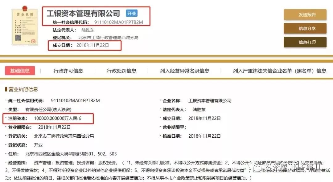 基金君查询工商注册信息发现,工银资本管理有限公司成立于2018年11月22日,注册资本金为10亿元人民币。公司经营范围是资产管理、投资管理、投资咨询、股权投资等。公司法定代表人为陆胜东,陆胜东是工银投资的副总裁,也是工银资本的董事和经理;同时,工银资本的董事长是工银投资总裁张正华。欢迎关注:投资圈那些事儿