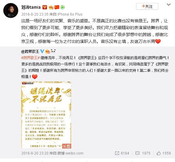 2016年《跨界歌王》刘涛夺冠,许多人为王祖蓝打抱不平,直呼冠军被内定,对她的骂声也随之而来。这时她发了一条微博,感谢了节目组的付出,也肯定了对手的实力,没有伤害任何人,成功化解了这场争论。