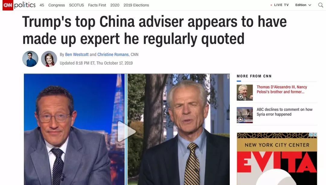 当地时间10月16日,美国总统特朗普首席经济顾问纳瓦罗(Peter Navarro)登上了美国各大媒体的版面——不是因为经济政策有了重大变化,而是因为——他在反华书籍里多次引用的专家是捏造的。
