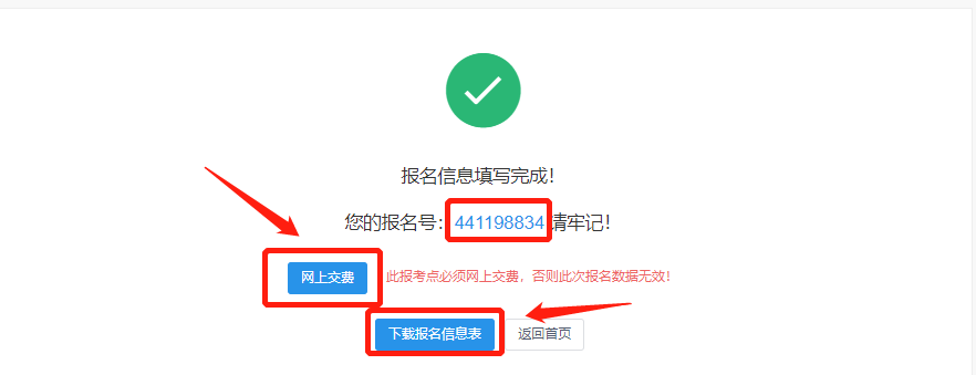 仔细核对考生信息的每一项,确认无误后点击“确定”,显示操作成功界面后点击“返回首页”