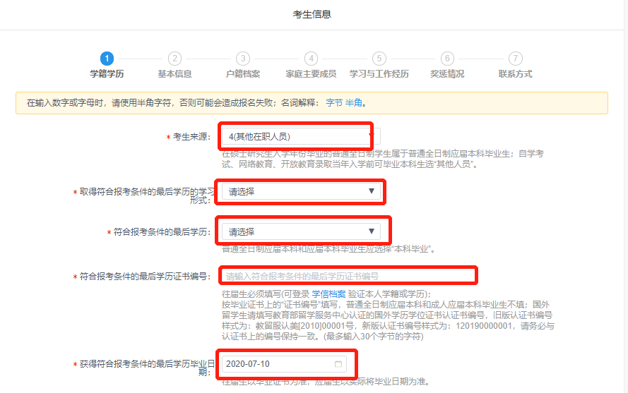 填写学籍学历,*号的必填,考生来源选“其他在职人员”;最后取得学历的学习形式、最后的学历和最后的学位选符合报考资格的学历(如符合报考资格的学历为全日制本科,则取得最后学历的学习形式选“普通全日制”,最后学历选“本科毕业”;若符合报考资格的学历是专科,则在最后学位中选“无”,没有拿到学位证的在最后学位选“无”)。